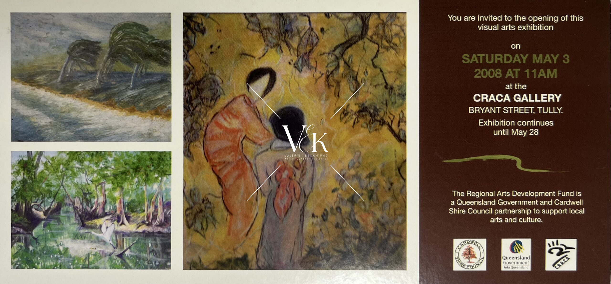 As coordinator and curator, Valerie brought to light the vibrant work of women artists who painted in Tully during the 1950s and 1960s. The artists were Molly Collins, Win Chandler, Olive Kelly, Cecilia O’Loghlen, Jean Exelby, Gladys Henry, June Hill, Betty Senko, Sue Bulman, Amy Jago, Brenda Jago and Viv Teitzel who took advantage of adult education classes being held in Tully. Notable tutors included Noel Woods, Arthur Evan reid, Andrew Sibley, John Coburn,Laurie Thomas, Hal Missingham, Merv Dodds, Eric Jolliffe, Bela Ivanya and Merv Moriarity. The exhibition of the artists work was held at CRACA Gallery in Tully and was funded by the Cardwell Shire Council RADF program and showcased the rich artistic heritage of the region.